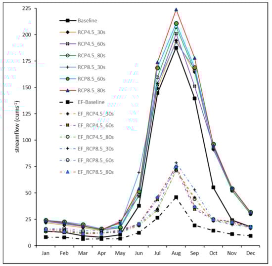 Comparison of monthly mean streamflow between the observed (1991–2014) and the projected values by the ensemble of three GCMs and the corresponding environmental flow under current and future climate conditions.