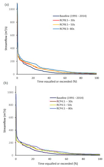 Figure 7 shows the comparison between the flow duration curve during the baseline period (1991–2014) and the three future periods (the 2030s, 60s, and 80s) under RCP 4.5 and RCP 8.5 at the Chepang Station. Under both scenarios, the probability of the occurrence of flow and the magnitude of flow could be higher in the Babai River Basin.