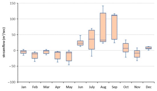 The streamflow obtained from the calibrated SWAT model is shown in Figure 6. The predicted streamflow under RCP 4.5 and 8.5 for the near, middle, and far future also presented in the supplementary Tables S3–S5. As can be seen, the consequences of the rise in temperature and increase in rainfall are reflected in future streamflow. The ensemble of three GCMs shows that streamflow could increase by around 24% in the 2030s and 2060s and by 27% in the 2080s under RCP 4.5 and by 28% in the 2030s, 32% in the 2060s, and 37% in the 2080s under RCP 8.5 as compared to the baseline flow (from 1991 to 2014). The pattern of flow is quite similar to the baseline period flow of the river. The increment in streamflow is maximum under RCP 8.5—2080s in August when streamflow will rise by 36.4 m3/s, which corresponds to around 20% more flow than obtained in August in the baseline period. In terms of percentage, streamflow is predicted to increase the most in November under RCP 8.5—2080s, with an increase of almost 125% as compared to the baseline flow of the same month. The increase equals 30.5 m3/s.