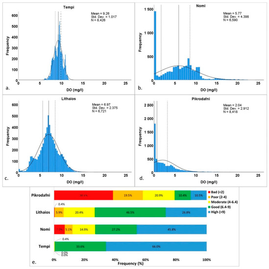 Frequency distribution of DO (mg/L) hourly concentrations for stations (a) Nomi, (b) Tempi, (c) Lithaios, and (d) Pikrodafni (dotted line: 25th percentile, solid line: 50th percentile, dashed line: 75th percentile), and (e) frequency distribution of DO (%) hourly concentrations of monitoring sites per water quality class.