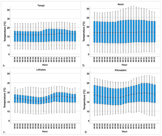 Hourly boxplots of water temperature (°C) for stations (a) Tempi, (b) Nomi, (c) Lithaios, and (d) Pikrodafni.