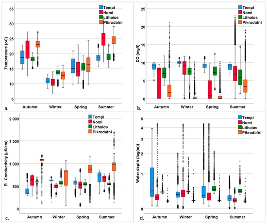 In Figure 5a, the seasonal variation of water temperature is evident, with the lowest values being reported in winter (December, January, and February) and the highest values in summer (June, July, and August), while in autumn (September, October, November), the water was warmer than in spring (March, April, May). The lowest and highest values were reported at Nomi Station. The seasonal variation of DO was small. However, in Pikrodafni, high outliers were noted during the entire year, while in Lithaios, low outliers were reported in winter (Figure 5b). As shown in Figure 5c,d, the electric conductivity and the water level had no pronounced seasonal variation; however, it can be observed (Figure 5d) that lower water level values occurred at all stations in summer.