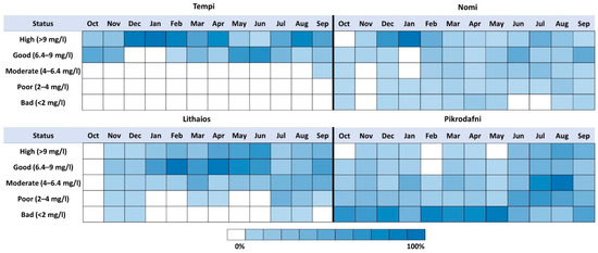 From the distribution of DO values along months and quality classes according to the heatmaps (Figure 6), Tempi was the only site maintaining high and good status, almost always with the vast majority of the measurements being above 9 mg/L (high status). In contrast, the Pikrodafni DO values were distributed throughout the entire spectrum of the natural variations, but with the majority of the measurements less than 6.4 mg/L (moderate to bad status). Nomi and Lithaios Stations were in an intermediate condition, with high variations of DO values, but with most of the measurements being above 6.4 mg/L (good or high).