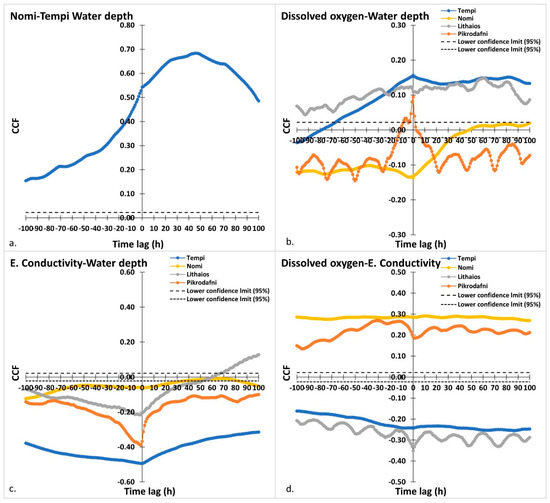 The cross-correlograms (CCF) between dissolved oxygen and electric conductivity (Figure 7c) and between water temperature and dissolved oxygen (Figure 7d) at Nomi and Pikrodafni Stations demonstrated positive but low values, while Tempi and Lithaios Stations indicated low, negative values. Additionally, no time lag was detected.