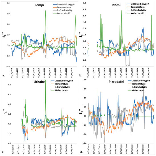 Finally, based on the RAPS curves, DO and water depth seem to be consistent for most of the high peaks in Tempi and Lithaios. This implies that the significant amount of water entering the system during heavy rainfall was also rich in DO. However, the same pattern was not observed in Nomi and Pikrodafni, where in high flows, DO levels either decreased or remained approximately the same due to the pollution sources existing in the sites’ basin. At Tempi and Lithaios stations, the Sk** values of dissolved oxygen and temperature were in most cases opposite, as expected, while in the case of Nomi and Pikrodafni, this pattern was not obvious, which means that there were other factors affecting DO more than temperature at these sites (pollution). Electrical conductivity illustrated an opposite fluctuation pattern in relation to water depth at Tempi and Lithaios stations, which was explained by the low EC values of the rainfall that caused water depth peaks.