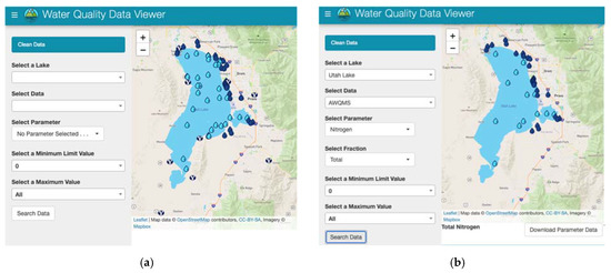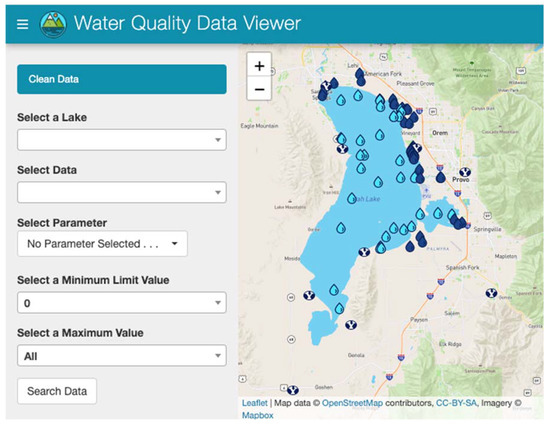 The source code of WQDV is available via a GitHub repository at https://github.com/BYU-Hydroinformatics/lake_parameters (accessed on 7 June 2021). This version of WQDV is installed on the BYU Tethys server. Tethys platform is an open-source and anyone has access to the WQDV app through the Tethys Portal (https://tethys-staging.byu.edu/apps/ (accessed on 7 June 2021)) and searching for the Water Quality Data Viewer app. Users can setup their own Tethys server if they want more control of the application. Instructions for setting up a Tethys server are available (https://www.tethysplatform.org/ (accessed on 7 June 2021)). The data used for the application are stored on HydroShare at https://www.hydroshare.org/resource/cf0133c4d4a14a7f938918707abb4e05/ (accessed on 7 June 2021). Users can access this HydroShare server or build their own for their version of WQDV.