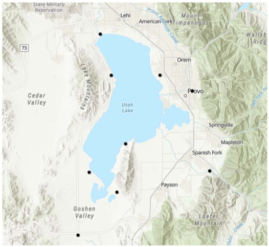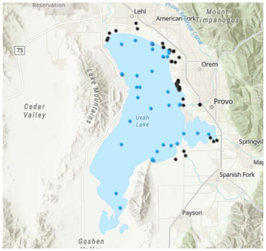 Utah Lake AWQMS Stations, blue dots are in-lake stations, black dots are out-of-lake stations.