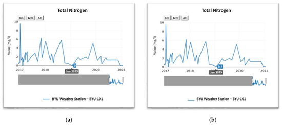 Timeseries for Total Nitrogen at BYU-101 station. Data January 2019: (a) the minimum value equal to 0; (b) the minimum value equal to reporting limit.