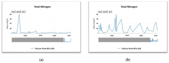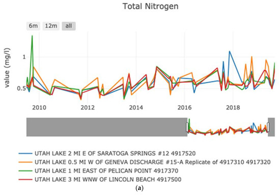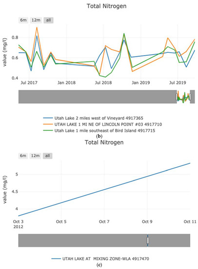 The WQDV application includes capabilities to visually select locations and parameters and graph the resulting data. For this case study, the AWQMS data we use is from 1 January 1989 to 31 December 2019. Figure 8 shows timeseries of some Utah Lake stations from AWQMS with total nitrogen data. From the time series graphs of each station, we can understand that not all the stations have the same number of measurements for total nitrogen. In this analysis, we found that some stations have total nitrogen data consistently from June 2009 to September 2009 (Figure 8a), while others have started to collect total nitrogen data in May 2017 continuing through September 2019 (Figure 8b). We also found that the station 4,917,470 has only two measurements for total nitrogen (Figure 8c).