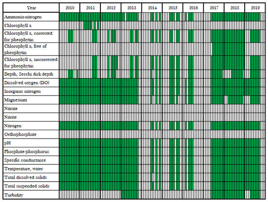 Even though there are many data, the various stations or measurement locations are not consistent with how the data were collected over time. Figure 6 shows that for any given analyte, there are large gaps in time. This issue is exacerbated when looking at individual stations, many of which only have minimal, i.e., one or two, measurements. Figure 6 shows the Utah Lake data accessed from the AWQMS database for the years 2010–2019 in which at least one station had a measurement for the analyte. As noted, the data are much sparser at any individual station.