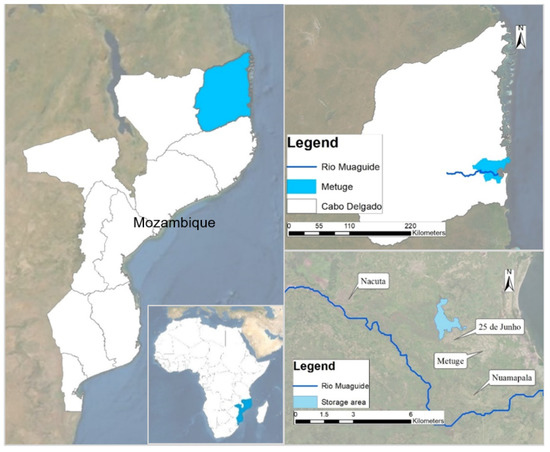 Furthermore, according to the IWMI (International Water Management Institute) report [5] Mozambique is among the countries with greatest need for water storage. Therefore, the objective of the present study has been to propose an intervention able to achieve a dual purpose of flood prevention (the primary aim) and water harvesting [6]. In fact, in Africa 70% of the population is agriculture-dependent [7] and water availability is a crucial issue for many rural communities. In these contexts, a spate irrigation system could be a best solution, guaranteeing livelihood and increasing the people’s adaptive capacity to climate change [8,9,10,11,12,13]. However, in order to quantitatively support the proposal of a flood mitigation measure, the hazard assessment is of primary importance [14,15]. The latter requires a particular effort due to the data scarcity that typically characterizes less developed countries [16,17]. In this study a coupled hydrological and hydraulic model is presented, which provides improvement in floodplain simulation, especially in data scarce regions [18]. The study presented in this manuscript is part of a cooperation project called ADAPT, funded by the Italian Agency for Cooperation to Development. ADAPT took place in 2017–2020 with a primary objective of improving the local adaptation to the negative effects of climate change in two areas of Mozambique. The present manuscript, therefore, does not relate to a specific research (for example, the scaling properties of any hydrological process) but rather to a comprehensive application of known approaches to a real-world relevant case.