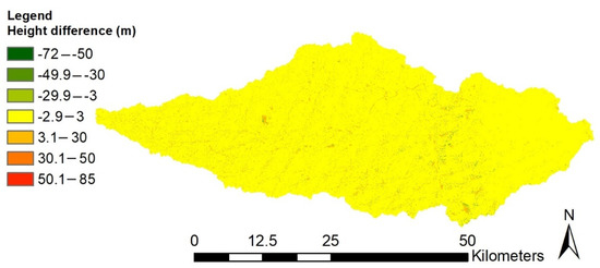 Map of the elevation difference between Alos Palsar DEM and SRTM 30 DEM.