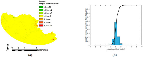 Second, the elevation difference between couples of DEMs has been computed maintaining, as a common subtrahend, the SRTM DEM with the spatial resolution of 30 m. The differences have been initially computed for the entire watershed, as preliminarily determined by GIS operations (Figure 5). As expected, the two SRTM DEMs were in good agreement with each other; by contrast, the difference between ASTER and SRTM (not shown here; for further details, see [26]) was quite significant; finally, the comparison with ALOS PALSAR returned the better match, also in terms of maximum difference in elevation with respect to SRTM. In a further comparison, since the study area is much smaller than the entire basin, elevation differences have been also computed for an area covering only the final part of the river (Figure 6a,b) depicts the distribution and the cumulative distribution (in terms of class frequency of values) of the difference between the elevations of ALOS PALSAR and SRTM 30. As can be noted from Figure 6b, the difference between ALOS PALSAR and SRTM presents a tail vanishing after 4 m, while for the case of ASTER DEM it was negligible only for differences greater than 12–15 m (plot not shown here). It can be further considered that hydrological and hydraulic processes may depend on ground slopes beyond ground elevations; therefore, the SRTM and ALOS PALSAR have been compared also in terms of local slopes. A map of slope difference values and distributions of the difference samples are provided in Figure 6c,d, respectively. The most populated class is again that centred on zero, even though the class amplitude is relatively large compared to the typical slopes in the area (in the order of 1 to 2 per mill).