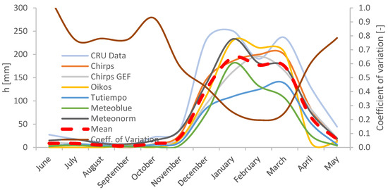All these sources have been compared on a mean monthly base. The time scale used for comparison was thus quite coarse, yet this was the minimum required to include all the sources. From Figure 7 the dry and the wet seasons can be clearly distinguished for each set of data, even if with some differences attributable to several causes such as point or systematic error, instrumental or recording error and method used for spatial interpolation of the data [17]. The plot includes also a mean curve, which has been computed as an average weighted on the number of years covered by each source, and a curve for a monthly coefficient of variation, estimated as the ratio between the standard deviation and the mean rainfall value. As discussed in other studies [17,29], the difference between the products was lower with higher rainfall. In fact, during the rainy season the coefficient of variation was below 20%, that has been considered encouraging for the reliability of the following evaluations. In the absence of a criterion to establish which source was most accurate, the analysis was prosecuted with the data of Meteoblue that provided the highest temporal resolution.