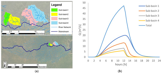 (a) Location of the four sub-basins. (b) Discharge hydrograph resulting from the hydrological modelling with a return period of 10 years.