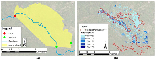 (a) Computational domain, main river path and boundary condition location. (b) Water depth map returned by the hydrodynamic model and flood extent obtained from satellite images taken after cyclone Kenneth (red boundary, same as in Figure 2).