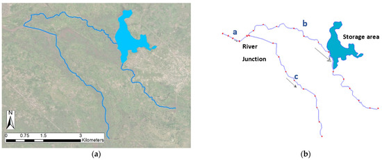 (a) Map of the intervention proposed: considered channels and natural reservoir. (b) HEC-RAS scheme used for the modelling: reaches, river junction, storage area and sections.