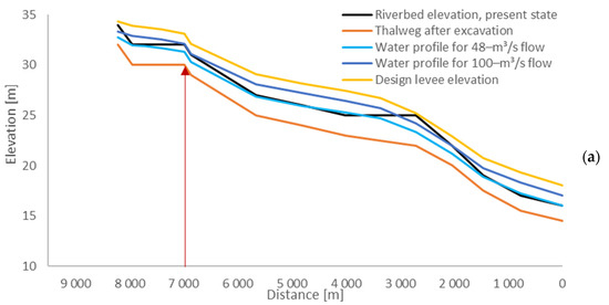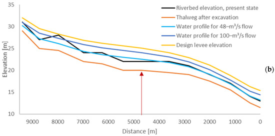 The design profiles of the considered river reaches are depicted in Figure 12, where one notes: a smoothing of the bed profile compared to the present condition; a combination between sediment excavation and levee construction; a freeboard considered for the water profile with 100-y return period; the maximum profile that has been obtained for the 10-y return period. A different width of the excavation has been considered in the three reaches, with widths of 30 m for reach a and of 10 m for reaches b and c. The iterative design process that has led to the configuration depicted here is presented in detail in [26]. The synthetic properties of the design configuration are as follows: the volume of excavated material is equal to 410,000 m3 and a great part of it (370,000 m3) is used for the construction of the levees, achieving a good balance between excavation and reuse.