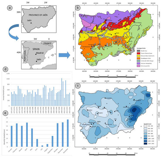 From the climatic point of view, the province of Jaén corresponds mostly to the hot summer Mediterranean (Csa de Koppen) [67] climate type. More specifically, it can be catalogued as the Mediterranean meridional type of the Guadalquivir valley [68]. This is characterized by a mean annual precipitation (MAP) between 500 and 650 mm, with maximum values distributed between the autumn, winter, and spring and minimum values in the summer. Meanwhile, the average temperatures are 17–18.5 °C, with very pronounced maximum values in summer. However, there are sectors in the province with MAP higher than 1000 mm in the mountain ranges (Mediterranean mountain), and others with MAP that does not reach 400 mm in the southeast (Mediterranean arid), as shown in Figure 1c.