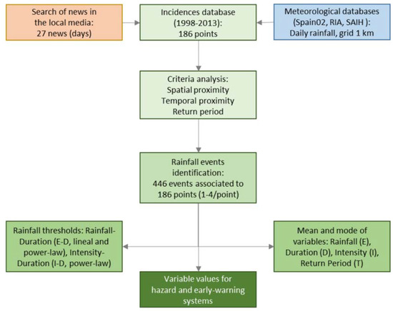 - The temporal proximity was addressed by analysing the time interval between the date of the news appearing in the local media and the month associated with the previously selected incidences. Five classes were also considered: Class 1, 0–3 months; Class 2, 3–6 months, Class 3, 6–12 months, Class 4, 12–24 months; and Class 5, more than 24 months. Summing the classes for the spatial and temporal proximities, only those incidences with a maximum of 6 points (e.g., Class 3 in both, or Classes 2 and 4 in each one) were selected. Thus, each incidence point could be associated with several rainfall events and their rainfall–duration (E–-D) pairs. In addition to the events identified from the news, the complete rainfall series for the two years previous to the month of each incidence were examined, searching for the major events in each interval of duration. If events different from the above were found, they were also added to the database.