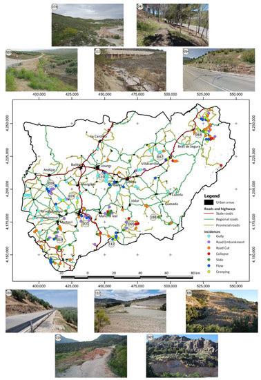 Finally, the recorded and reviewed incidences were digitized onto the orthophotography and subsequently refined using several GIS tools (e.g., clipping, buffering). The result was an enriched incidence inventory or database of the road network of the province. A basic distinction was made between two categories: the lower magnitude and shallower processes that affect the road surface, road cuts, and embankments; and the higher magnitude processes that involve a certain general slope instability. Among the former, the following types were differentiated: erosive processes (gullies), undercut of road embankments, and small slides and collapses of the road cuts. Among the latter, slides, earth or mud flows, and creeping processes were differentiated. The inventory is presented and described in Section 3.1.