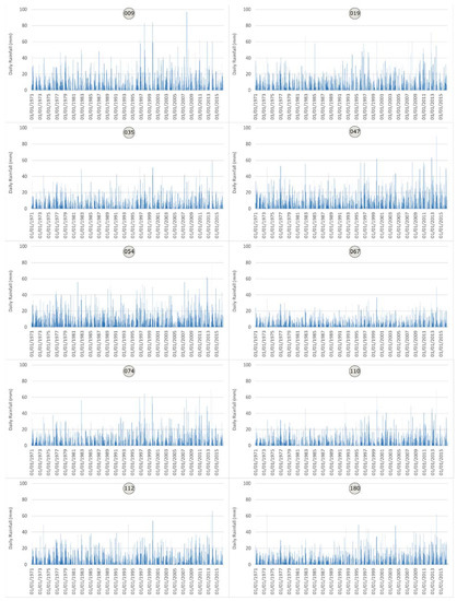 Figure 4 shows the daily rainfall series associated with the aforementioned significant incidence points (shown in the map of Figure 3), where different rainfall events can be observed. Following the methodology described, the rainfall events associated with each incidence were searched in the two years (24 months) previous to the starting of the repair work. Thus, Figure 5 shows the two-year rainfall series for different event durations in two significant incidence points (099 and 181, not shown in Figure 3). Some arrows in red have been included to point out the rainfall events identified in each incidence, which were later used in the thresholds calculation.