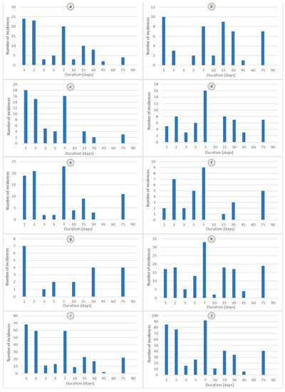 Duration of rainfall event for incidences of the different typologies (a): Gullies; (c): undercut in road embankments; (e): slides in road cuts; (g): collapses; (i): total of lower magnitude (very shallow) incidences; (b): slides; (d): flows; (f): creep; (h): total of higher magnitude (shallow) incidences; and (j) all incidences.