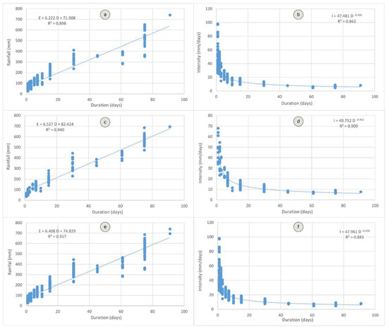 Rainfall thresholds: (a) E–D for lower magnitude incidences; (b) I–D for lower magnitude incidences; (c) E–D for higher magnitude incidences; (d) I–D for higher magnitude incidences; (e) E–D for all incidences; and (f) I–D for all incidences.