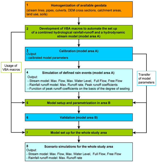In order to obtain flood characteristics for the actual state of land use, a method was developed that consists of several steps, each involving the use of different software tools (Figure 5). The individual steps are described in detail in the following subsections.