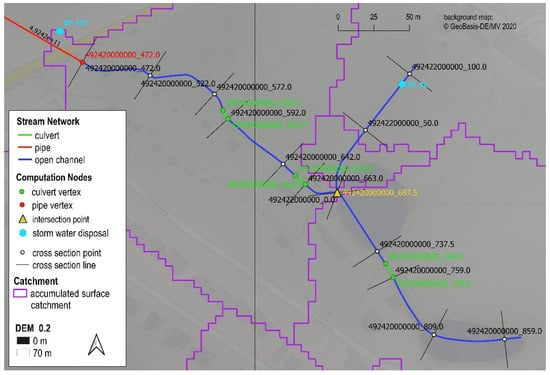 The catchment and stream model setup was developed and tested in a case study using the Schmarler Bach site. The combined model was consistently built up on the basis of homogenized geodata using VBA macros (VBA—Visual Basic for Applications) to automate the process. By splitting the river course in fairly short sections of about 50 to 100 m, spatially high-resolution flood characteristics (maximum flow, maximum head, maximum capacity, etc.) can be provided for a relatively large area.