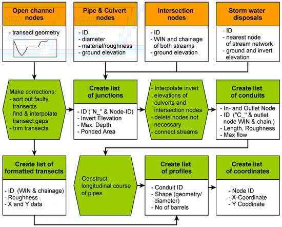 Hydraulic flow model build-up—steps to create the SWMM-input file (orange: QGIS output; green: VBA/Excel steps; white boxes contain respective attributes).