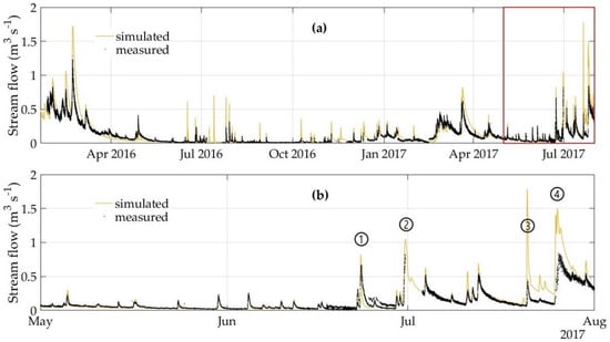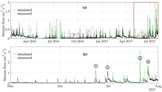 Comparison of simulated and measured flows at the monitoring station (chainage 3+413) of the Carbäk stream (validation site); the red box in the upper (a) diagram marks the time span of the lower (b) diagram.