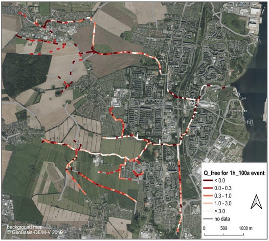 Figure 13 illustrates the free capacities in m3 s−1 of the 50 m segments of the Schmarler Bach system at the example of a 1 h rain event with a 100 a return period. Values smaller than zero (dark red) indicate that the segment is already overloaded and overflowing. This is particularly critical when it affects vulnerable land uses and their infrastructural facilities that should not be flooded during a 100-year event, as is the case for example in the northwest of the area. Measures should be introduced here to reduce peak flows. As well, redensification should only be approved if the proportions of the water balance variables are not shifted towards intensification of surface runoff at the expense of infiltration and evaporation.