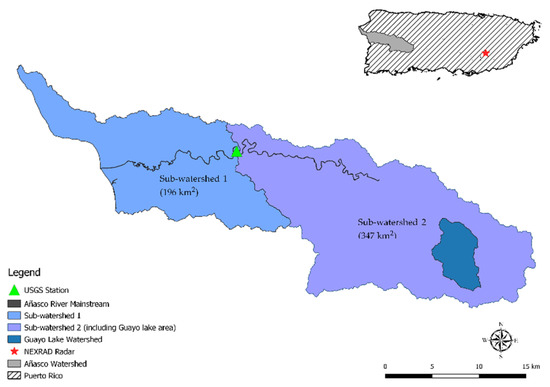Añasco watershed located in PR. Sub-watershed 1 represents the watershed area below the USGS stream discharge gauge, and Sub-watershed 2 represents the watershed area above the USGS stream discharge gauge.