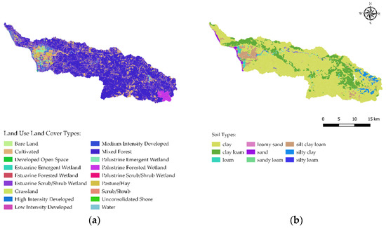 Land use land cover and soil dataset maps are essential for hydrologic simulations, allowing the association of land and soil properties into the model, such as roughness values, hydraulic conductivity, porosity, capillary head, and field capacity. Figure 4a shows the 30 m resolution land use land cover map for 2010 [63]. It was the most recent high-resolution land use land cover classification map developed for PR. The predominant land cover categories for the study area are Mixed Forest, Cultivated, and Low Intensity Developed Areas. On the other hand, Figure 4b shows the Soil Survey Geographic Dataset (SSURGO) over the Añasco watershed, which was acquired from the United States Department of Agriculture (USDA [64]). For this dataset, Clay and Clay Loam are the most representative soil categories in the Añasco watershed.