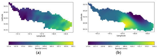 Figure 7 shows WRF precipitation rainfall, NWS cumulative rainfall, and the error in percentages between the WRF and NWS cumulative rainfall. A correction of the WRF time series was performed using the cumulative WRF rainfall and the NWS interpolated rainfall for the whole of PR; for this correction, it was assumed that the temporal distribution of the rainfall in the WRF model was correct. Therefore, the only variable to modify was the spatial distribution of the rainfall. To correct rainfall, Equation (7) was used to compute the distributed error between the two cumulative maps with respect to the WRF cumulative rainfall. Subsequently, Equation (8) was implemented to adjust the original hourly WRF precipitation values using the distributed errors previously described to obtain the corrected hourly WRF precipitation.