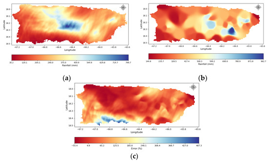 (a) WRF cumulative precipitation rainfall in millimeters over PR, (b) NWS cumulative rainfall in millimeters over PR, and (c) error in percentages between the WRF and NWS cumulative rainfall over PR.