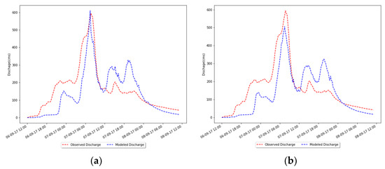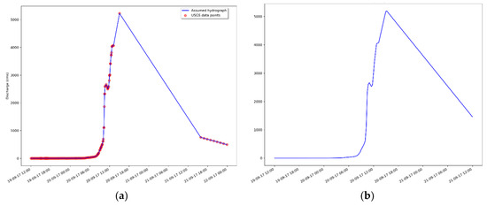 - During Hurricane María, the USGS stream discharge gauge stopped working when it reported a maximum discharge measurement of almost 5200 m3 s−1, assumed to be the peak discharge for the whole event. Consequently, there is a gap of nearly 24 h where there is no data available, and after that, the USGS reported an estimated discharge. A simple linear regression was employed to interpolate the data to fill the gap and obtain time series values every 15 min. Figure 8a shows the final built hydrograph superimposed on the USGS discharge data. The time series, limited to 48 h (Figure 8b), was used to simulate the inflow boundary condition at the upstream location in Sub-watershed 1 for two scenarios (defined below).