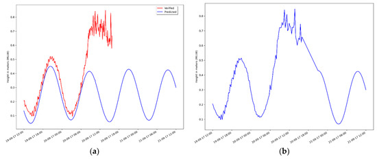 According to the Hurricane María report developed by NOAA, the storm surge in Western PR reached values between 1 and 3 feet (0.3 and 0.9 m) [60]. A NOAA tide station (9759394) was identified close to the coast of the Añasco watershed, which contained data from predicted and partially observed water height levels during Hurricane María. It was noticed that the maximum height of the water level (using the Mean Lower Low Water, MLLW) was approximately 0.85 m. Subsequently, it was decided to merge the predicted and the observed data to obtain a height water level variation over time. The last point of the observed data was merged with the closest predicted water level height to create a smooth curve, as shown in Figure 9.