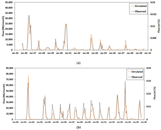 Time series plots of modelled and observed streamflow: (a) calibration period; (b) validation period.