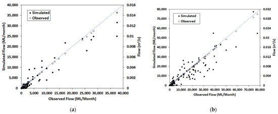 Scatter plot of modelled and observed streamflow: (a) calibration period; (b) validation period.