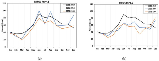 In near future, the percentage decrease in projected rainfall relative to the observed rainfall is the highest in March by 39% and September by 28% according to the MIROC-RCP4.5 and MIROC-RCP8.5 projections, respectively, whereas the percentage increase in projected rainfall is the highest in December by 64% and 40% for MIROC-RCP4.5 and RCP8.5, respectively as shown in Table 2.