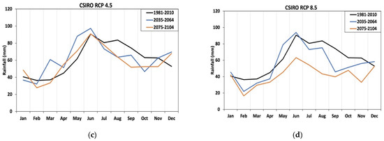 Similar to MIROC model results, the CSIRO model rainfall projections for near and far futures are mostly less than the observed rainfall. According to the CSIRO-RCP4.5 model, monthly projected rainfall is higher than the observed rainfall from March to June and December for the near future, and from April to June, January, and December for the far future. Additionally, the CSIRO-RCP8.5 model projected higher rainfall values than the observed ones in January, May, June, and December for the near future. The CSIRO-RCP8.5 rainfall for the far future was projected to be lower than the observed rainfall in all months excluding January and December.