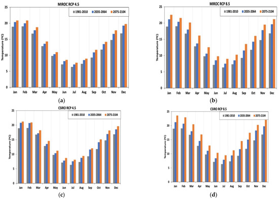 Observed and projected monthly average temperatures: (a) MIROC-RCP4.5 model; (b) MIROC-RCP8.5 model; (c) CSIRO-RCP4.5 model; (d) CSIRO-RCP8.5 model.