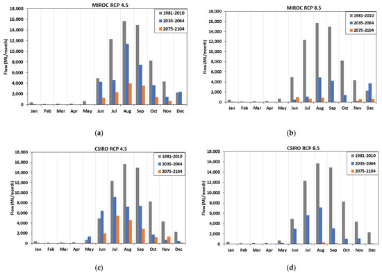 The streamflow values in the UCC were simulated for the 1981–2010 period using the observed rainfall and temperature data in the IHACRES model. Then, streamflow projections over near and far future periods were generated using rainfall and temperature outputs of MIROC and CSIRO models under RCP4.5 and RCP8.5 scenarios in calibrated IHACRES model. The observed and projected monthly streamflows as well as the percentage differences (in brackets) between observed and projected streamflow values are tabulated in Table 6. As can be seen in Table 6, monthly streamflow values were projected to decrease considerably in the future periods, with higher declines from the models using climate data under the RCP8.5 scenario. As discussed before, the rainfall reductions along with a remarkable increase in the temperature are the main reasons for decreases in the streamflows. Table 6 results are graphically presented in Figure 6.
