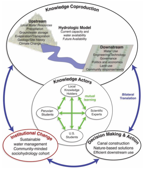 The conceptual model of knowledge coproduction, applied to a hydro-social framework [11]. Here, scientific experts, local knowledge-holders, and U.S. and Peruvian students combine their forces, to learn from one another and coproduce upstream and downstream knowledge. The result is local environmental knowledge (ILEK) [12,13,14] that integrates upstream and downstream disciplines, and western and traditional science, to inform decision-making and promote institutional change, such as sustainable water management.