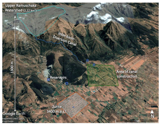 Water resources in the Peruvian Andes are impacted by humans at global, regional, and local scales. Global-scale climate forcing accelerates the melting of glaciers, impacting water supply (e.g., see [6,7]). Local and regional development projects, such as hydroelectric dams or mining operations, impact water use and drive laws affecting water accessibility (e.g., see [8,9]). Additionally, traditional Indigenous practices, dating to pre-Inca times, govern land management and aquifer recharge, and inform local water use and community water allocations (e.g., see [10]). These activities result in complex spatiotemporal effects on the water supply and create challenges for the study of water resources and the implementation of sustainable water management in the region. Carey et al. developed a socio-hydrology framework bridging natural and social sciences to model how downstream communities may adapt to changes in local water supply [11]. The focus of their study was the Santa River basin, a watershed in which communities, mining operations and hydroelectric dams compete for shrinking supplies of glacial meltwater. In addition to scientific data to understand water resources, Carey et al. incorporated five human variables—politics and economics, laws and institutions, technology, land and resource use, and societal response—into their framework. The framework provides a useful link between science and society, as these factors strongly influence communal water use and sustainable water management.