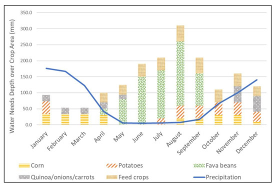 Average monthly precipitation (mm) and typical monthly irrigation needs (mm) for major crops grown in Zurite. The need for water is most acute in the dry winter to irrigate fields of fava beans, feed crops, and recently planted corn (August-November). Figure by W. Wunderlich and A. Virgil.