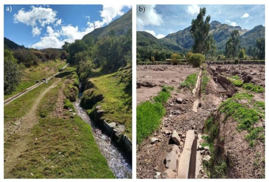 The efficient use of water resources in Zurite is challenged by limited storage, an aging infrastructure, and, in at least one case, a lack of community-based knowledge. The community operates five reservoirs with a total storage capacity of 10,500 m3. This volume is substantially below dry-season irrigation demands and necessitates some fields being left fallow [75]. These reservoirs do not, nor were they intended to, function as long-term storage but instead operate as water elevation controls, allowing the multiple low flow-rate water sources to accumulate prior to delivery. The reservoirs are filled and drained approximately daily during the dry season, as water users schedule irrigation delivery on a rotating schedule to meet individual families’ needs. Thus, the disruption of water delivered from both local and regional water supplies for even a short time can threaten a family’s crops and livelihood. The construction of these systems across steep and, in some cases, unstable terrain makes irrigation disruptions extremely common. Figure 6a illustrates the construction variety throughout most of the system—concrete canals with control gates that minimize seepage water losses run parallel to and in series with hand-dug, earthen canals. Figure 6b shows a previously well-designed and controlled canal, constructed by the municipality, after it was damaged by a debris flow in March 2019. The debris flow was caused by a poorly designed and hydraulically mismanaged larger canal in the upper basin that was installed by regional authorities to transfer water from the outlet of the URW to an adjacent small drainage channel. Here, national water organizations proceeded without the involvement of local knowledge in the canal design, which led, in part, to this catastrophic debris flow and the destruction of the canal and surrounding crops of corn.
