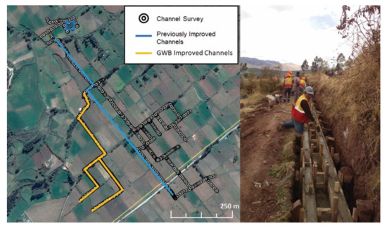 The left panel shows the area of canal improvements (green-shaded area of Figure 4). Circles show the extent of the irrigation canal network, with the blue square indicating the location of a surface reservoir that regulates flow to the canals. The blue line shows canals constructed by the community prior to 2018. The yellow line shows the extent of the 1.3 km of canals built through the Geoscientists Without Borders-funded Bonanza collaboration with the community of Zurite. The entire project totaled USD 71,283 and GWB’s contribution was USD 20,000. The photograph on the right shows the early phases of construction in fall 2019.